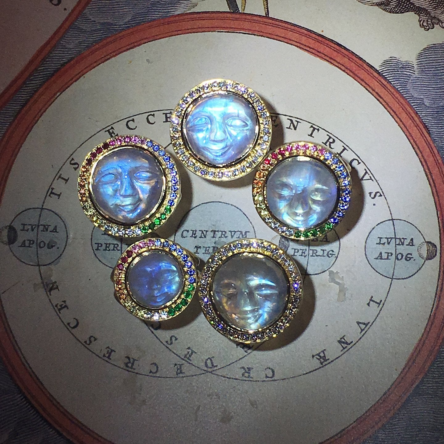 Dimensions: L: 40.77mm/1.60''; W: 20.65mm/0.81''; Stone Details: Blue Moonstone:9.23cts; Pink Sapphire:0.08cts; Blue Sapphire:0.33cts; Tsavorite:0.10cts; Light Green Sapphire:0.08cts; Ruby:0.08cts; Light Orange Sapphire:0.08cts; Medium Orange Sapphire:0.08cts; diamonds:0.09cts;